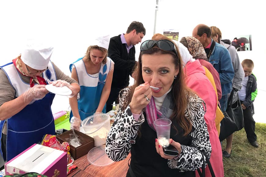 Палатка Поселений с молочными продуктами популярна! Дают попробовать молоко, творог. А больше всего народным дегустаторам нравится масло. Жалеют, что пока продукты нельзя купить!