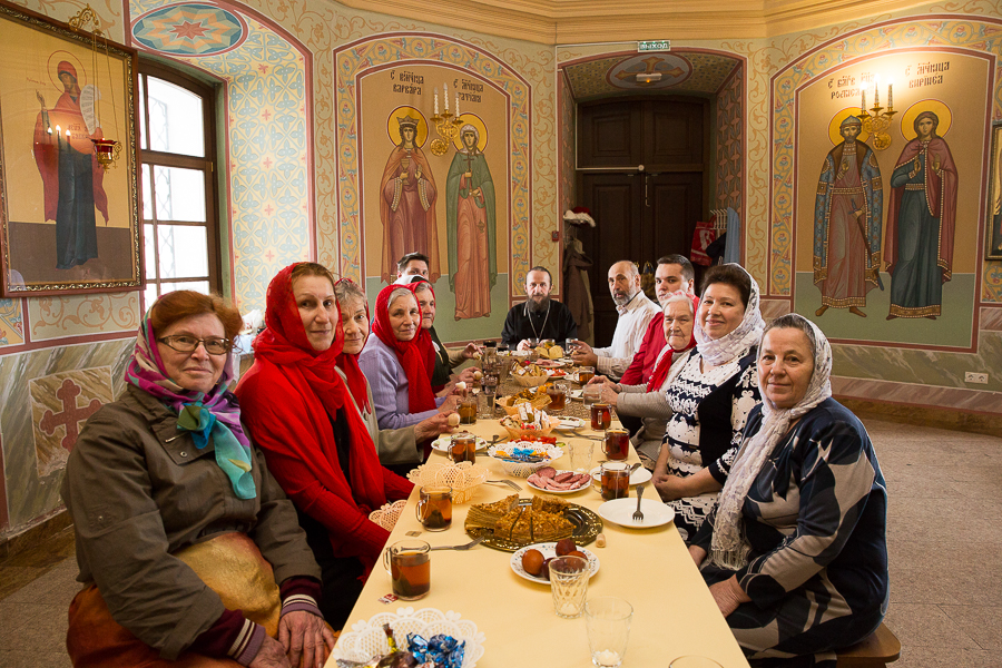 После переезда прихожане вместе с отцом Виктором собрались за пасхальным столом. Одну из прихожанок поздравили с 70-летием и подарили ей Библию.