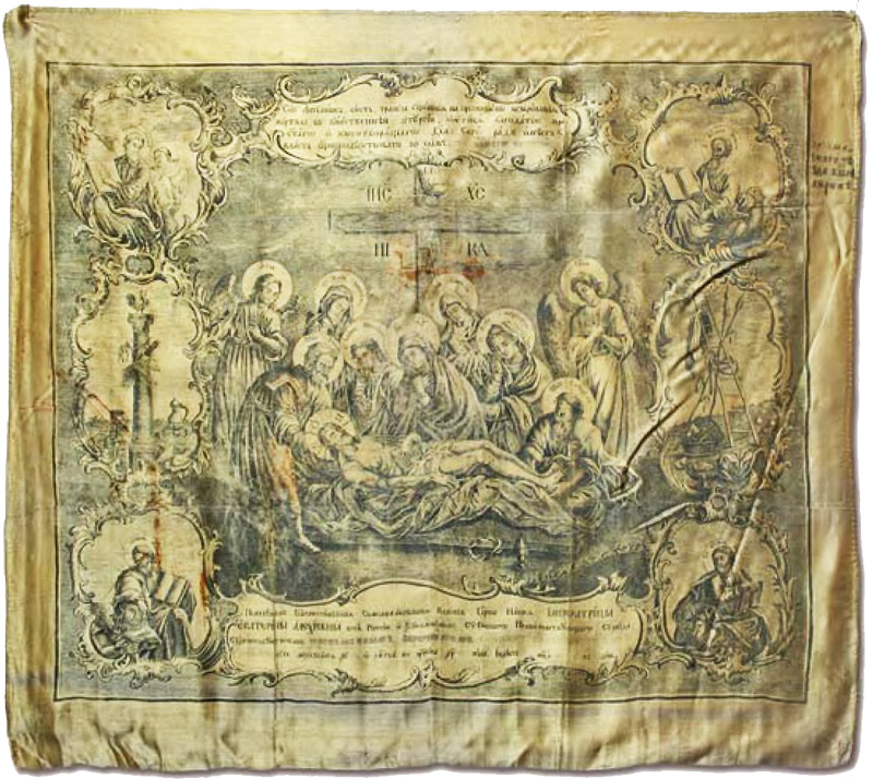 Антиминс церкви в честь иконы Божьей Матери, именуемой «Живоносный Источник», в селе Хирино Арзамасского уезда, 1777 год. Из коллекции антиминсов Церковно-археологического музея Нижегородской епархии (ЦАМНЕ)