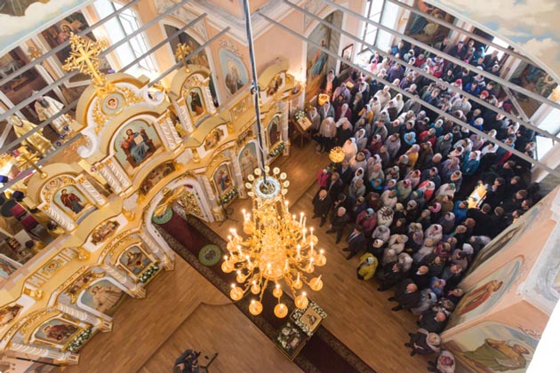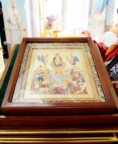 «…Если смотреть на храм с запада на восток, то есть со стороны колокольни, в очертаниях церкви легко узнать абрис знакомого иконописного сюжета. Контуры восьмерика с барабаном и главой в точности повторяют силуэт Пречистой Девы, которая по сюжету иконы парит в воздухе над чашей, держа на лоне Богомладенца Христа.