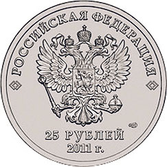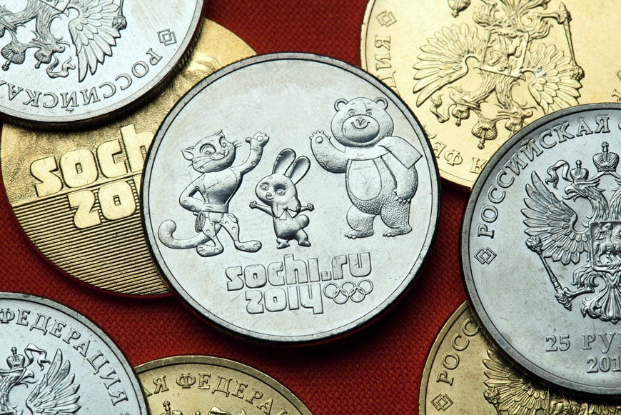 В 2011 году в обращение поступила новая российская монета достоинством в 25 рублей. На лицевой стороне монеты изображена эмблема Олимпийских игр в Сочи 2014 года. Первый тираж составил 9 750 000 штук. В обращении также есть похожая монета, но на ней надпись «Сочи» раскрашена синим цветом. Такая монета, в отличие от обычной, уже представляет коллекционную ценность. За неё продавцы просят от 300 до 500 рублей.