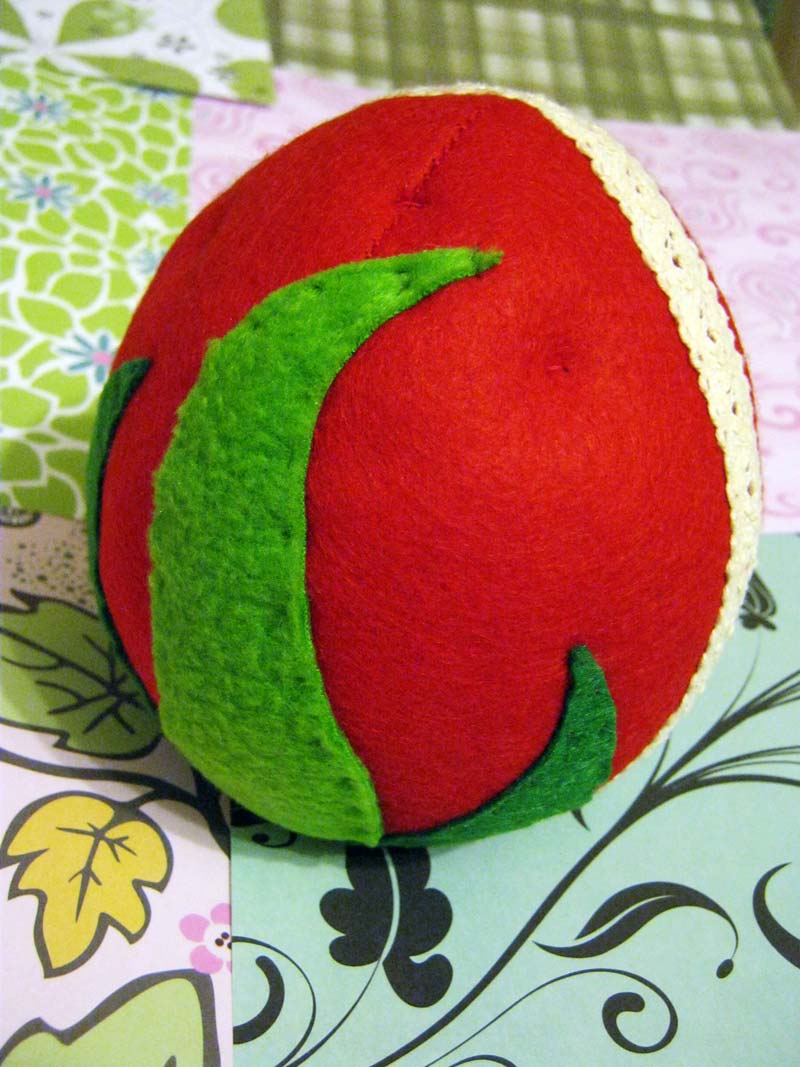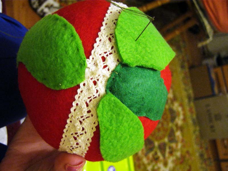 Вырезаем листочки из зелёного фетра и мягкого флиса, пришиваем их швом вперёд, следя, чтобы декор крепко держался.