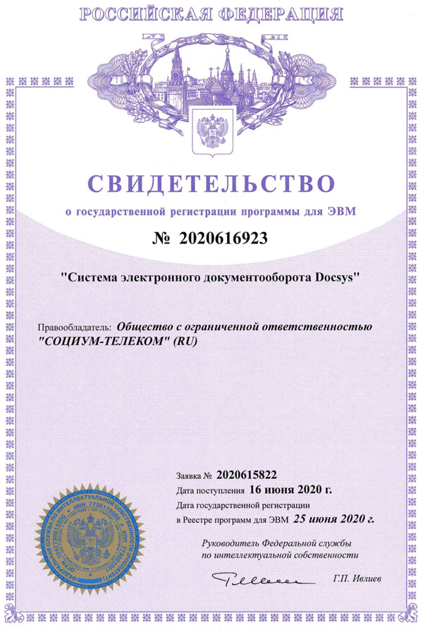 25 июня 2020 года новая разработка «СОТЕЛ» – система электронного документооборота Docsys зарегистрирована в государственном реестре программ для ЭВМ. Сейчас проходит процесс регистрации в реестре российского ПО. Оснастить системой рабочие места в холдинге «СОЦИУМ» и выпустить её на внешний рынок планируется в следующем году.