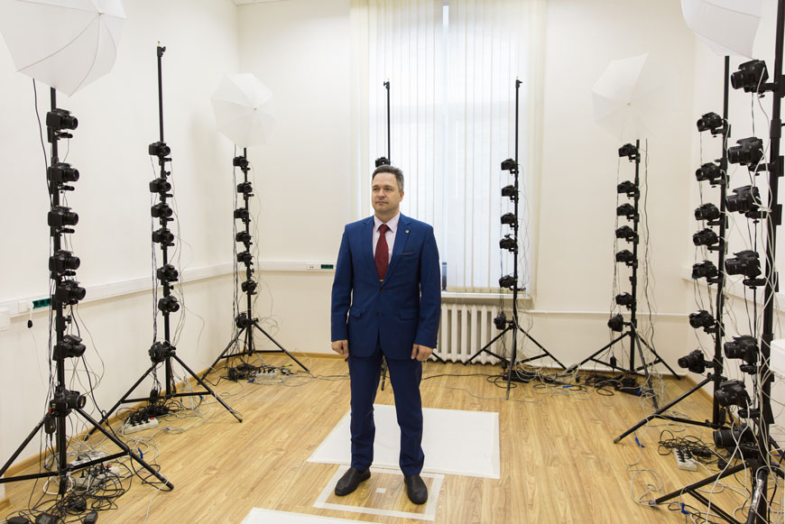 3D сканер – это, по сути, фотостудия, по периметру которой на 12 колоннах-штативах развешено множество синхронизированных камер. Фотостудия может работать и как выездная, то есть оборудование разбирается и собирается на месте, где клиенту удобно провести съемку.