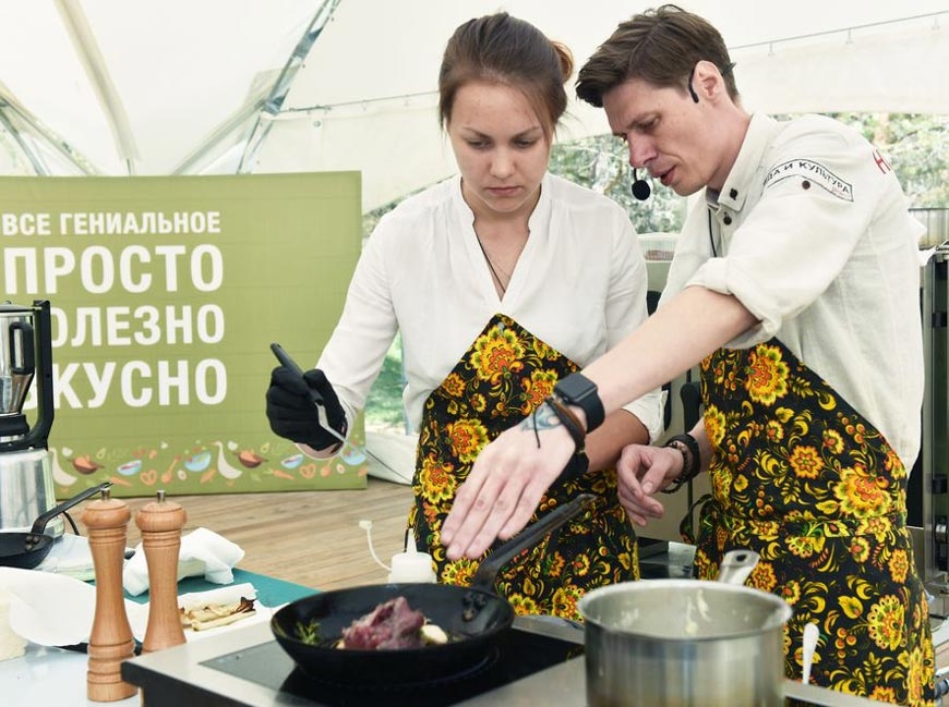 На «Кулинарном шоу» было приготовлено более 100 кг еды: лепёшки на мангале с томлёным гусем, бурятские буузы с мясом, свинина на вертеле и самый натуральный арзамасский гусь в маринаде с шишками и имбирной карамелью.