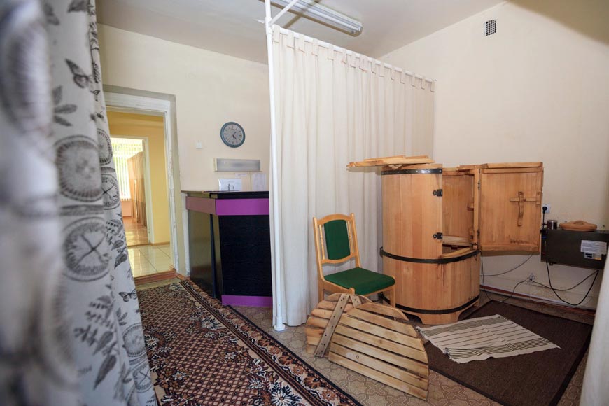 Для начала нужно пройти процедуру, которая поможет очистить кожу, вывести из организма шлаки и токсины, усилить обмен веществ. Для этого вам предложат распариться в мини-парной кедровая бочка.