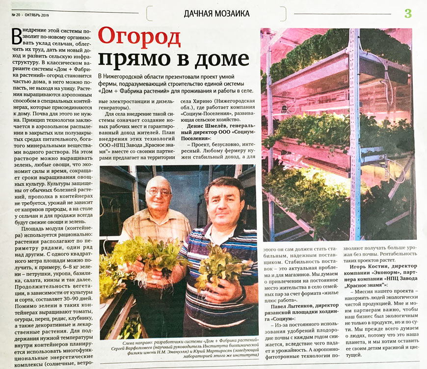 Внедрение этой системы позволит по-новому организовать уклад сельчан, облегчить их труд, дать им новый доход и развить сельскую инфраструктуру. В классическом варианте системы «Дом + Фабрика растений» огород становится частью дома, в него можно попасть, не выходя на улицу. Растения выращиваются аэропонным способом в специальных контейнерах, которые присоединяются к дому. Почва для этого не нужна.