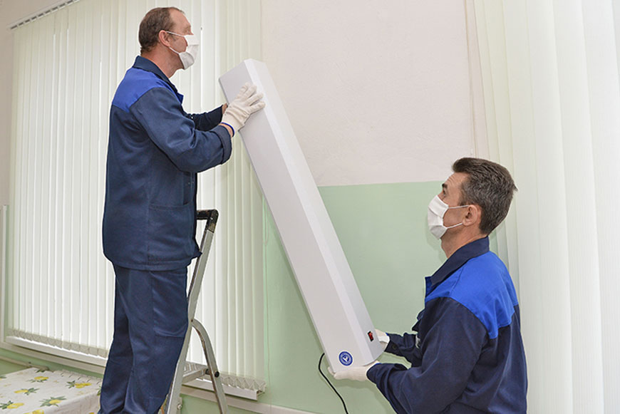 Монтаж рециркулятора в комнате приёма пищи цеха №19 АПЗ проводят электрики Иван Захаров и Александр Игнатьев