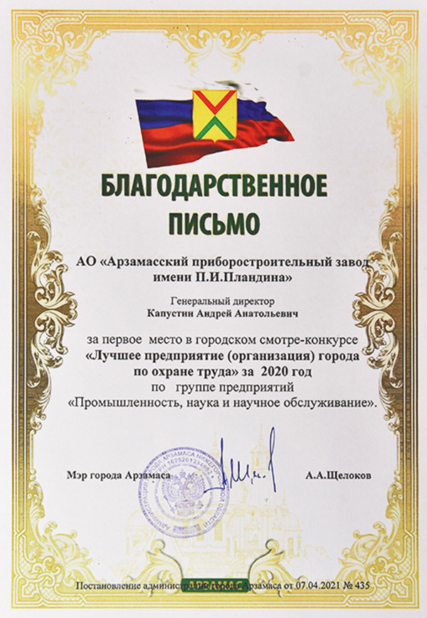 Благодарственное письмо администрации Арзамаса вручено предприятию на совещании, состоявшемся 30 апреля и приуроченном к Всемирному дню охраны труда.