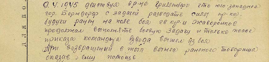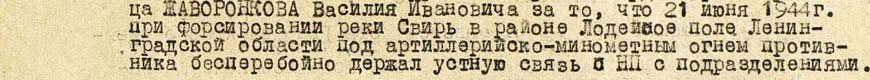 «Под ураганным огнём противника, действуя решительно и смело, быстро и своевременно доставлял боеприпасы к орудиям прямой наводки, чем обеспечил бесперебойное ведение огня и способствовал успеху боя» – гласит выписка из приказа о награждении Ивана Ивановича Жаворонкова.