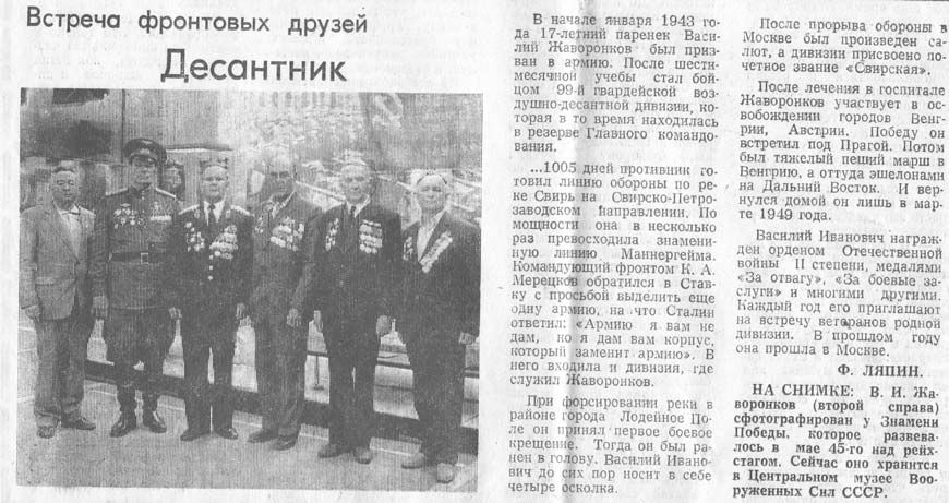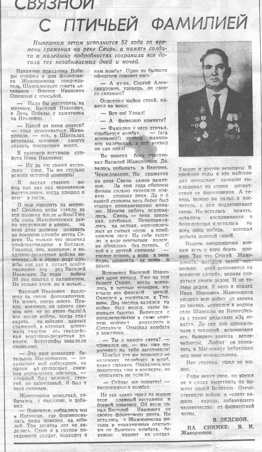 – Мой дед, Жаворонков Василий Иванович, попал на фронт в 17 лет, – рассказывает Ольга. – Он служил в воздушно-десантных войсках связистом. За время войны 36 раз прыгал с парашютом. Среди всех наград самыми ценными для него были медаль «За боевые заслуги» и медаль «За отвагу». Первую получил после форсирования широкой и глубокой реки Свирь, когда под сплошным огнём бесперебойно держал связь с командным пунктом. Это сражение было для деда самым памятным. Медалью «За отвагу» награждён после ранения. Уже будучи раненным, он выполнял боевой приказ и спас жизнь товарищу – вынес его с поля боя. У меня даже есть выдержки из приказов о награждении. Ещё мой папа сохранил газетные статьи о деде.