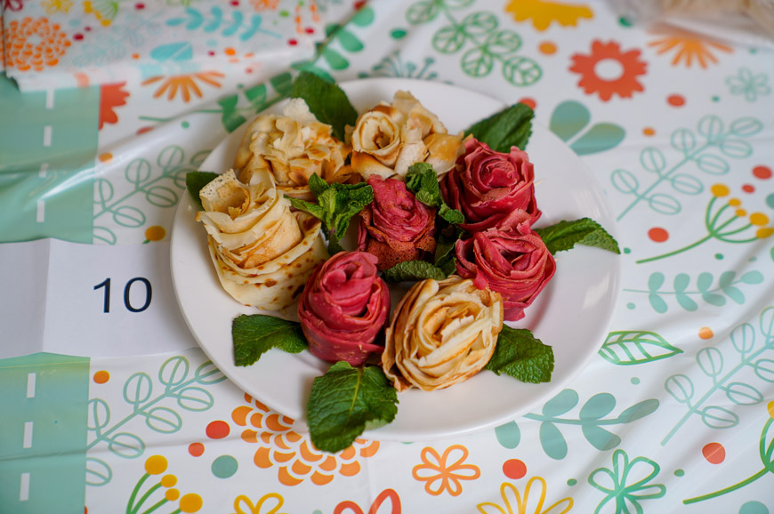 Победительница говорит: «Рецептик когда-то запоминала… цифрами: 500, 500, 2, 2, 1, 1. По порядку: мука, молоко, яйца, сахар, соль, подсолнечное масло. Густоту регулируйте на свой вкус, но в розы легче превращать тонкие блинчики. Для цвета добавляем свекольный сок и какао. А дальше, как говорится, только фантазия. По поводу формы: жареный блинчик раскладывается на тарелке; по кругу (от середины или от краёв – как удобно), по спирали вырезается полотно для лепестков, а затем скручивается в форму. Попробуйте! У вас получится!»