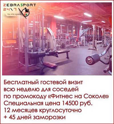 В период акции по промокоду «Фитнес на Соколе» предоставляется бесплатный гостевой визит, а также специальная цена – 12 месяцев круглосуточного фитнеса + 45 дней заморозки – 14500 рублей.