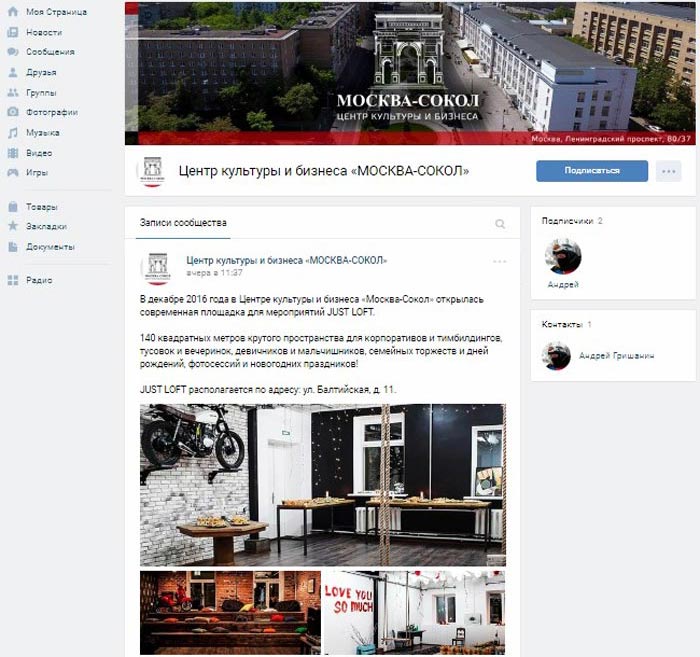 Адрес страницы в ВКонтакте vk.com/moskvasokol