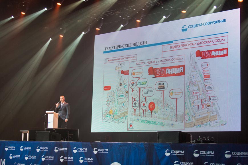 В этот день в «Стадиуме» – самой большой частной концертной площадке столицы, которая была выбрана местом проведения мероприятия, собралось более 300 гостей – арендаторов всех московских и подмосковных объектов недвижимости, которые находятся под управлением компании «СОЦИУМ-СООРУЖЕНИЕ». Главными организаторами мероприятия выступили ООО «СОЦИУМ-СООРУЖЕНИЕ» и ООО «МОСКВА-СОКОЛ».