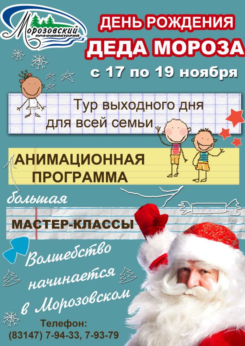 Почему новогодние праздники на самом деле начинают отмечать ещё в ноябре? Да потому что 18 ноября вся страна празднует день рождения Деда Мороза! В профилактории «Морозовский» это стало традицией с 2011 года. И 2017-й не будет исключением: в честь дня рождения Деда Мороза организуется специальный тур для всей семьи.