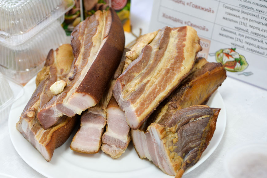 Гости попробовали копчёную грудинку и солёный шпик, холодец, сомовий студень, котлеты из мяса и рыбы, пельмени и фрикадельки, селёдочку пряного посола и жареные стейки из сома. Так что получился полноценный праздничный пир.