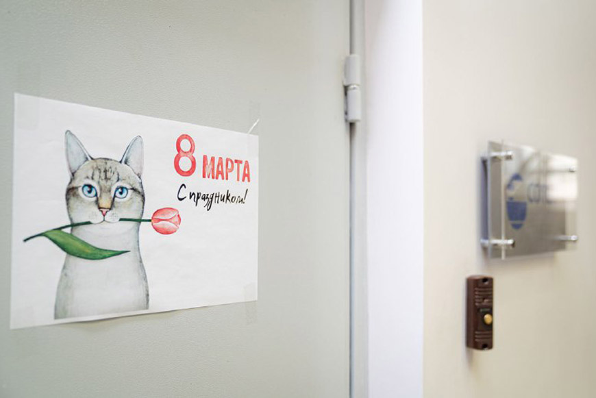 Евгений Афонченко и Артём Инкижеков ещё и заранее позаботились об оформлении офиса управляющей компании, чтобы сюрпризы и праздничное настроение встречали дам с самого утра.