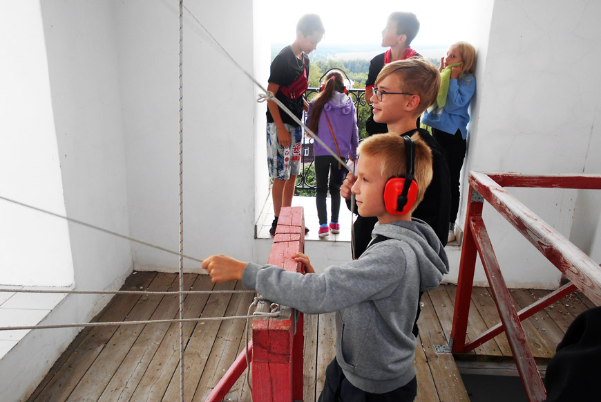 И хотя сейчас не пасхальные дни, гостям разрешили позвонить в колокола. Ученик Общественного центра и житель Хирина Миша Хохряков освоил профессию звонаря. Он раскрыл товарищам некоторые секреты своего дела и предложил попробовать.