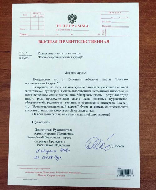 Свои поздравления «Военно-промышленному курьеру» прислали высокопоставленные читатели.