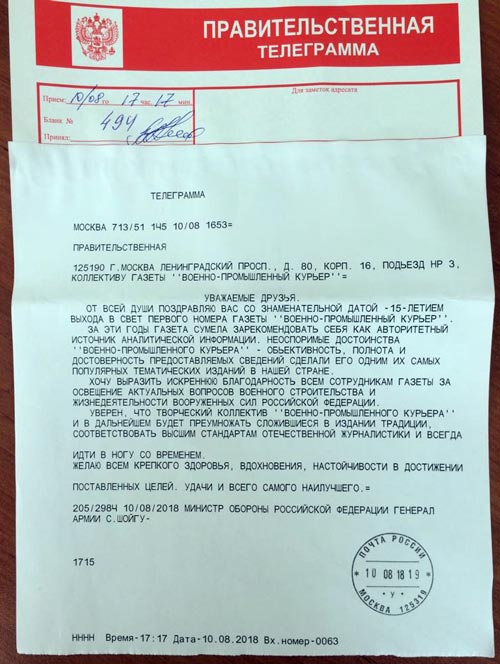 От имени ветеранов Великой Отечественной войны, коллектива учёных Академии военных наук Российской Федерации поздравляю вас с 15-летием со дня выхода в свет первого номера газеты «Военно-промышленный курьер»!