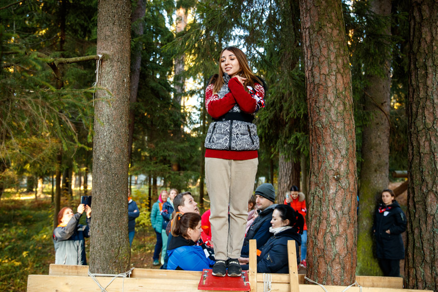 Одно из самых сложных и показательных упражнений на командную ответственность – «Падение на доверие». Человек, не глядя, падает с высоты на сомкнутые руки группы поддержки. Падение оказывается удачным только в том случае, если никто из участников, включая самого падающего, в этот момент не думает о себе: группа поддержки сосредоточена на том, чтобы поймать, а падающий на том, чтобы случайно не травмировать ловящих.