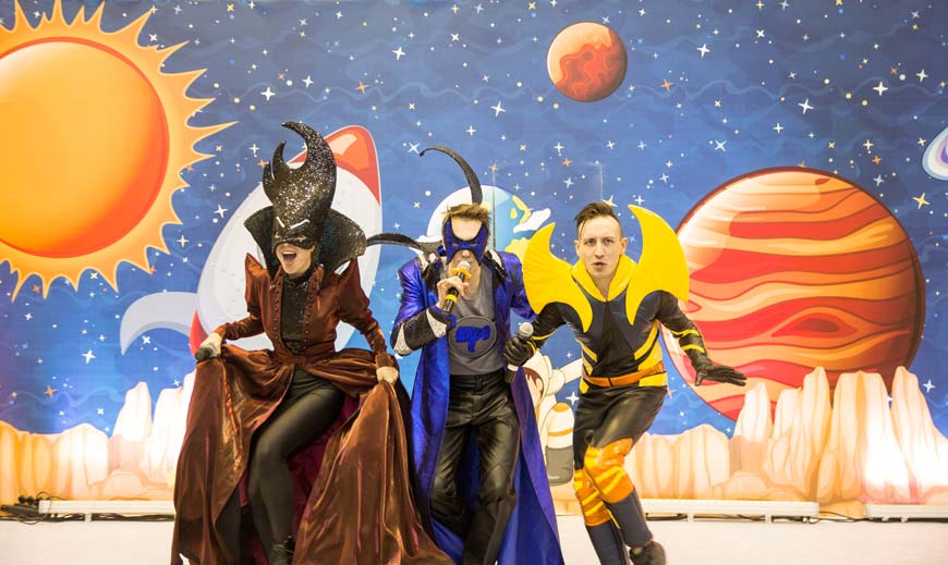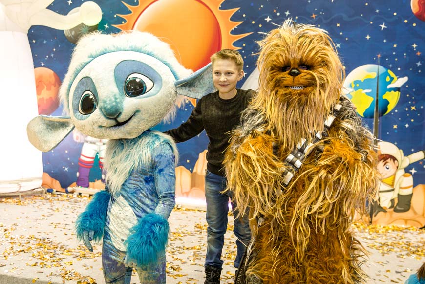 – Внимание! Звездолёт «СОЦИУМА» отправляется в своё дальнее путешествие! – предупреждает «пассажиров» весёлая инопланетянка, которая старается собрать ребят вокруг сцены, чтобы они могли поиграть с любимыми персонажами из «Звёздных войн» – джедаем, Чубаккой, Дартом Вейдером.