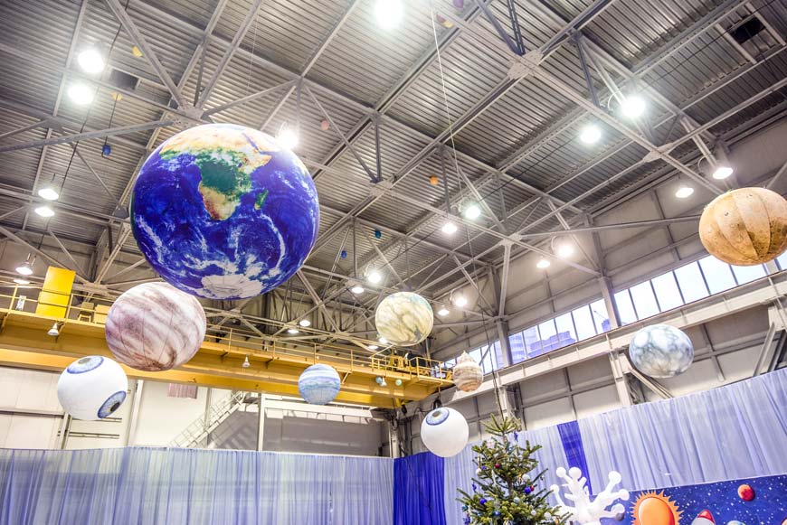 Над головой реют огромные воздушные шары – это парад планет, справа сцена с декорацией из тех же узнаваемых планет Солнечной системы, почти по всему периметру цеха расположились столы для мастер-классов.