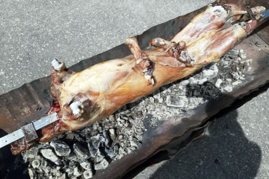 Так на фестивале готовили барашка на углях. Булат с Петей Павловичем обратили внимание на интересный способ закрепления ножек на животе.