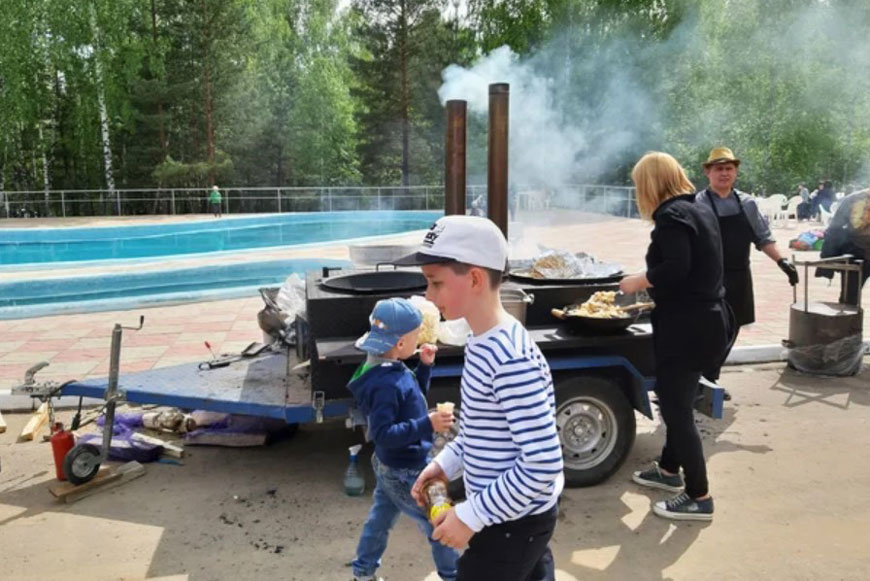 Там есть площадка условных фудтраков, где готовят еду. В этих походных казанах, например, делали очень хороший плов.