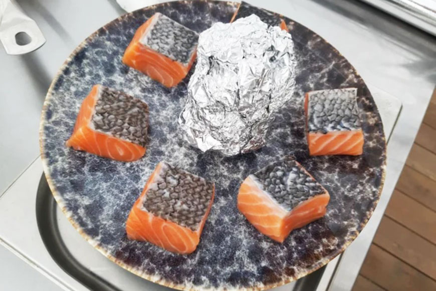 Саша Волков-Медведев, очень грамотный повар, умеющий к тому же хорошо объяснять самые сложные вещи, рассказал, как правильно томить жёсткие части говядины в красном вине и почему именно так. А тут он показывает, что вообще нет ничего трудного в быстром копчении рыбы. Под фольгой у него лосось.
