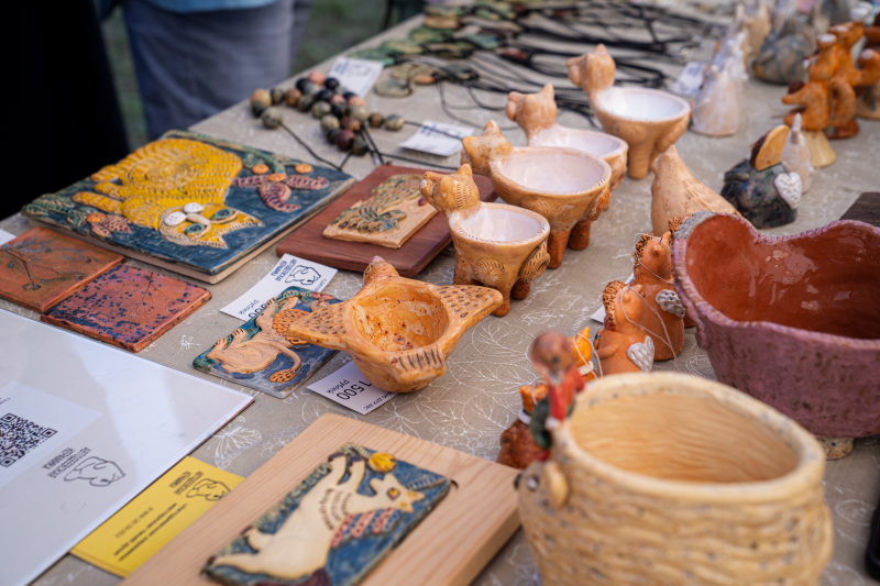 В назначенное время на главной площадке открылась ярмарка натуральных фермерских продуктов и изделий народных промыслов. Мастерами и умельцами были представлены изделия ручной работы: картины, украшения, одежда, деревянные и керамические фигурки и другие, а также продукты – сыры, мёд, хлеб, конфеты, пряники, мясные изделия, приготовленные по старинным и собственным рецептам, и многое другое. Кстати, палатки с фермерской и ремесленной продукцией тянулись и по обе стороны автодороги, ведущей от магазина «Хиринские продукты» до места проведения фестиваля.