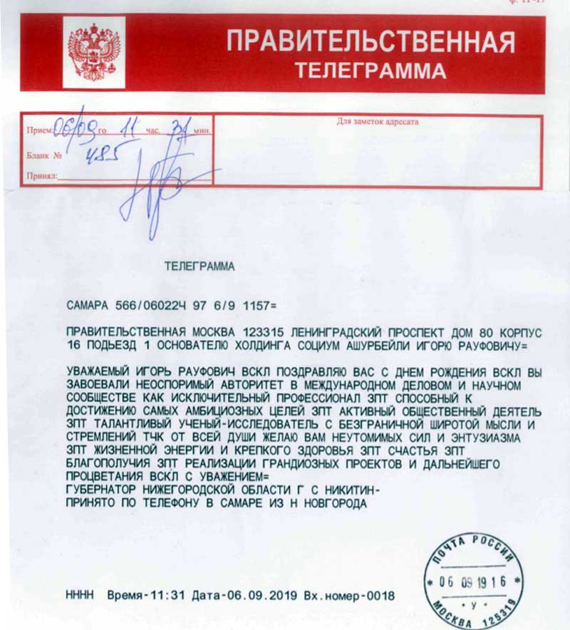 Поздравляю Вас с днём рождения! Вы завоевали неоспоримый авторитет в международном деловом и научном сообществе как исключительный профессионал, способный к достижению самых амбициозных целей, активный общественный деятель, талантливый учёный-исследователь с безграничной широтой мысли и стремлений.