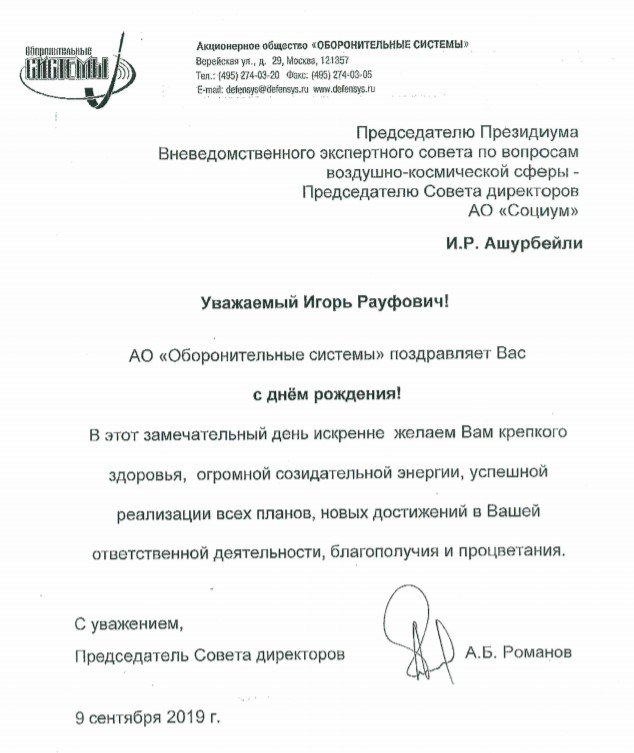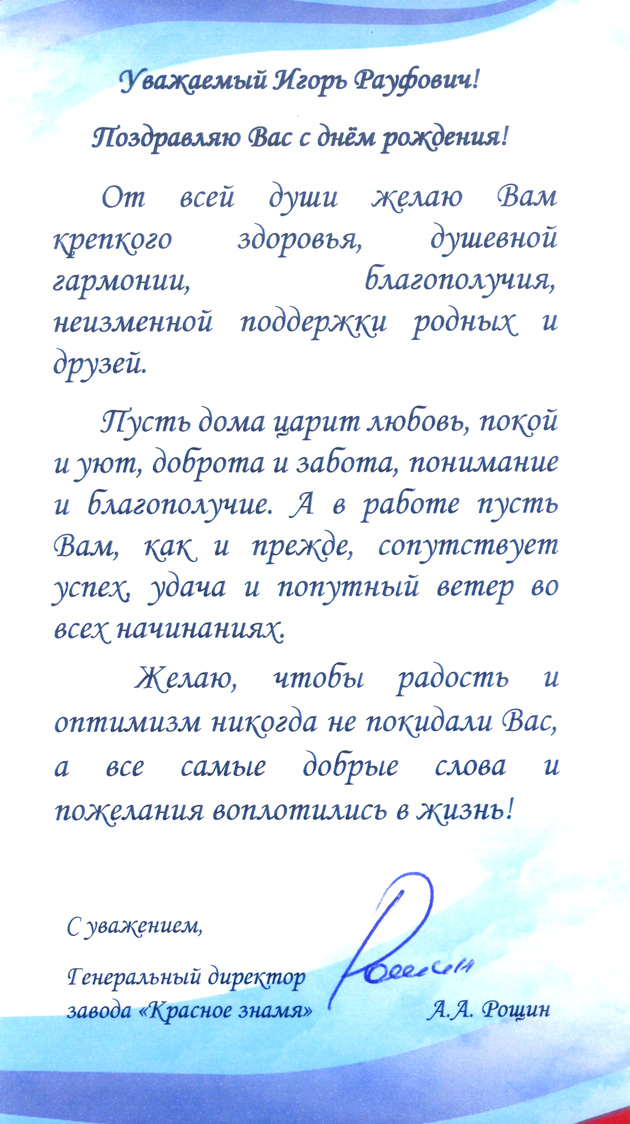 Мне доставляет большое удовольствие в возможности поздравить Вас с очередным днём рождения! Зная Вас лично, наблюдая в различных ситуациях за Вашей работой в ЦКБ «Алмаз» и корпорации «Алмаз-Антей», с уверенностью могу сказать, что Вы не из той породы людей, которые перед трудностями готовы «спустить флаг» или поступиться принципами.