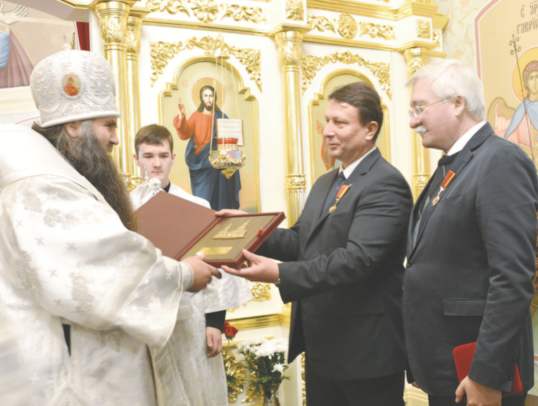 Митрополит Нижегородский и Арзамасский Георгий вручает О. Лавричеву и И. Ашурбейли ордена Русской Православной Церкви