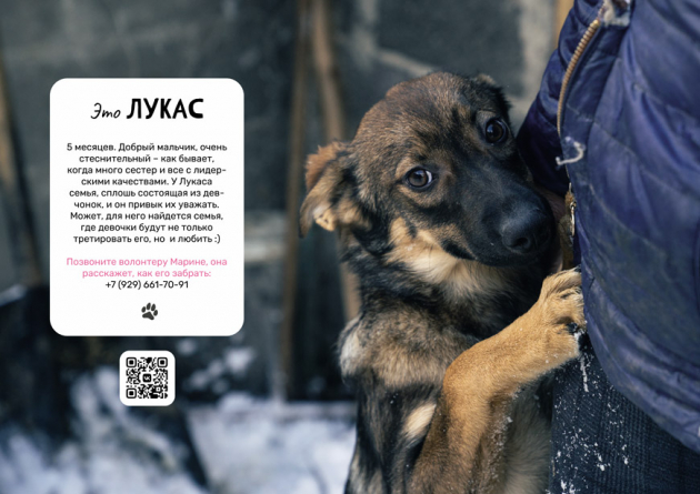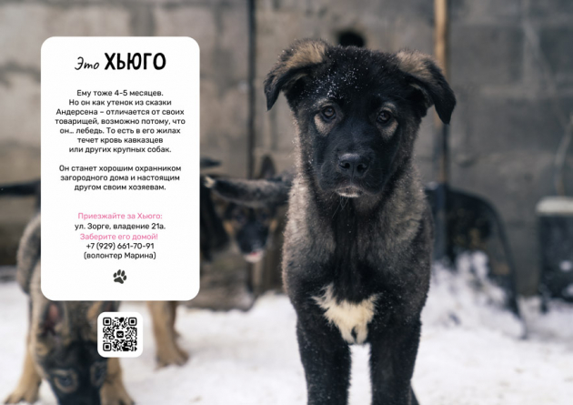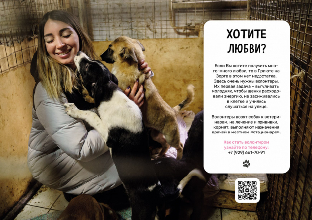 На этой выставке можно выбрать себе друга по фото, прочитав его историю, а затем позвонив волонтёру. С помощью фотопроекта «Ищу хозяина!» мы также постарались рассказать про основные нужды приюта на Зорге, разместили на фотографиях QR-коды, ведущие на его страницу ВКонтакте, и контакты волонтёра.