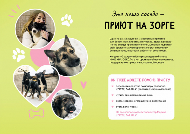 – «СОЦИУМ» не первый год оказывает поддержку приюту на Зорге. Так удачно совпало, что он находится неподалёку от офиса нашей управляющей компании, то есть мы практически соседи. В этом году «Партия Возрождения России» предложила провести благотворительную акцию в формате такой фотовыставки в нашем Центре культуры и бизнеса «МОСКВА-СОКОЛ». Мы надеемся, что выставка растопит сердца местных жителей и каждый из этих прекрасных щенков найдёт свой дом.