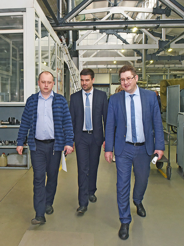 Заместитель директора по производству – начальник службы управления производством Андрей Захаров АО «АПЗ», заместитель директора по развитию – главный конструктор ООО «ЗМТ» Сергей Вершинин, директор ООО «ЗМТ» Марат Алексеев в цехе №56