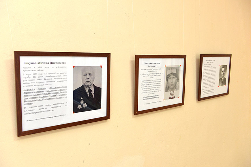 28 семейных историй заводчан о своих фронтовиках удачно вписались в общую композицию выставки. Примечательно, что начинается она с двух батальных полотен арзамасского художника, ветерана войны, приборостроителя Леонида Волкова. Затем на баннерах – трагическая история двух воинских подразделений 137-й и 160-й Горьковских стрелковых дивизий. Здесь же можно увидеть различные экспонаты солдатского быта из фондов музея: ручную гранату, двупалые варежки, подрывную машинку, сапёрную лопатку, миномётный снаряд и другие реалии военного времени.