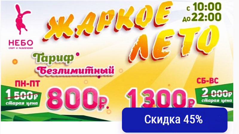 Программа лояльности, созданная компанией «СОЦИУМ-СООРУЖЕНИЕ» для поддержки партнёров, развивается. В июле появился новый участник. Батутный парк «НЕБО» проводит акцию «Жаркое лето. Тариф безлимитный» и приглашает принять в ней участие своих соседей – арендаторов Центра культуры и бизнеса «МОСКВА-СОКОЛ», а также жителей районов Сокол и Аэропорт.