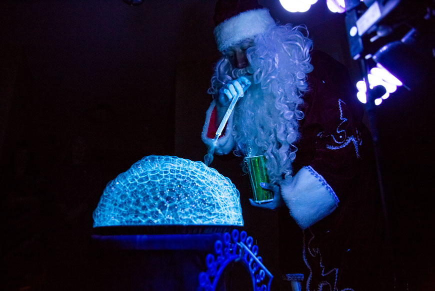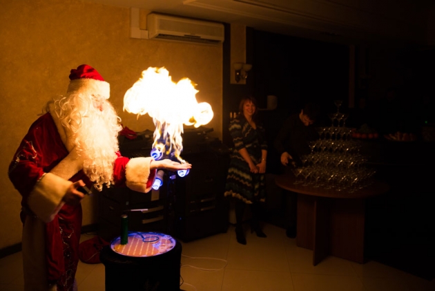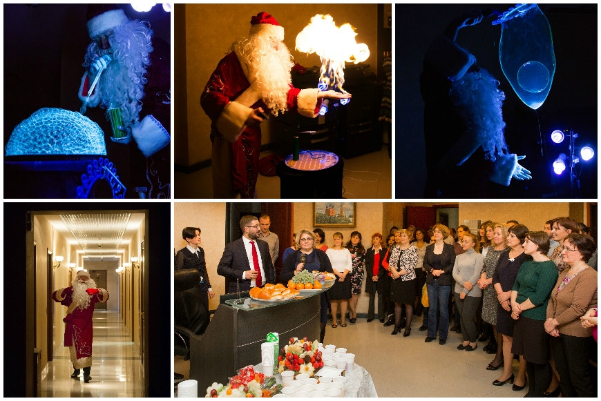 В холле офиса погас свет, откуда ни возьмись появился Дед Мороз, и началось волшебство: шоу мыльных пузырей.