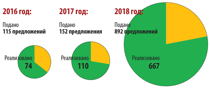 На предприятии подведены предварительные итоги конкурса на заявки. В 2018 году отмечен значительный рост поданных заводчанами предложений по усовершенствованию бизнес-процессов на производственных площадках.