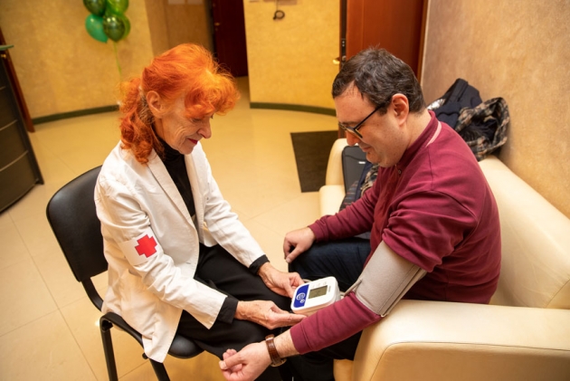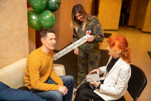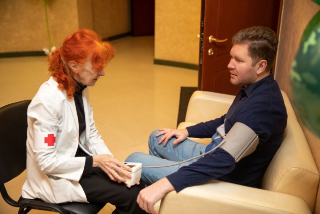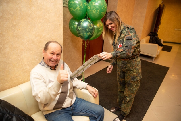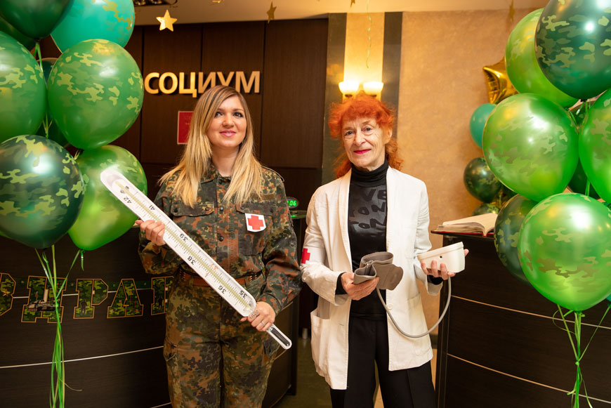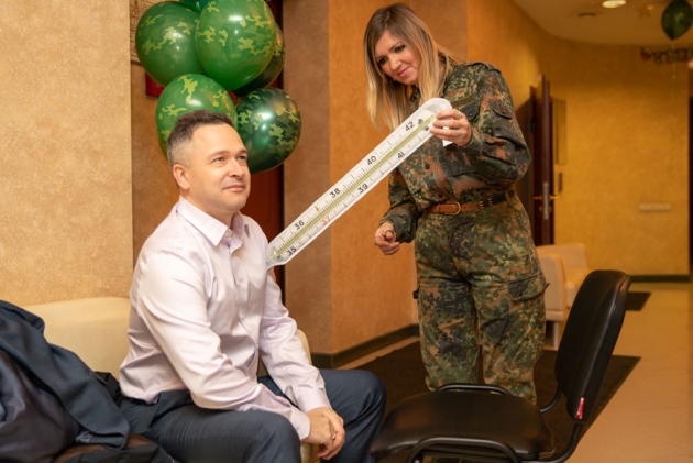 Всех пришедших на работу мужчин встречали «врач» и «медсестра» – сотрудницы «СОЦИУМ-СООРУЖЕНИЯ» Валентина Коменданская и Анастасия Ивенкова. Орудуя тонометром и градусником, они выясняли состояние здоровья будущих защитников и по итогам шуточного осмотра прописывали всем явиться к 13 часам на ресепшн.