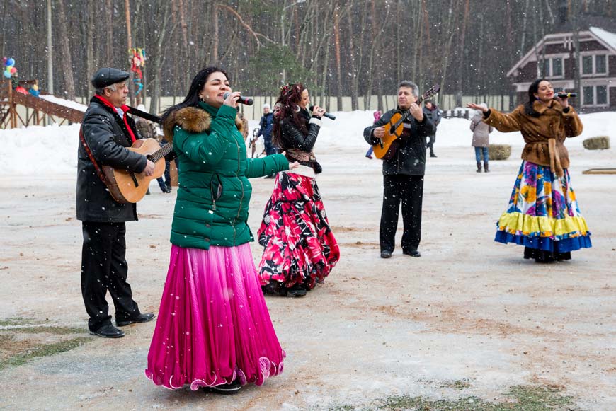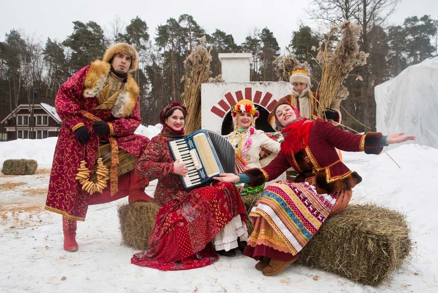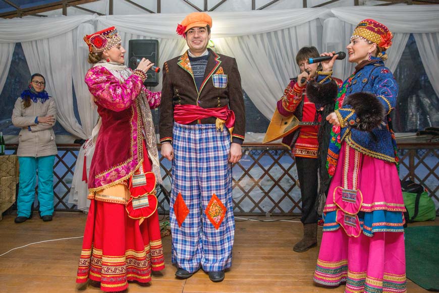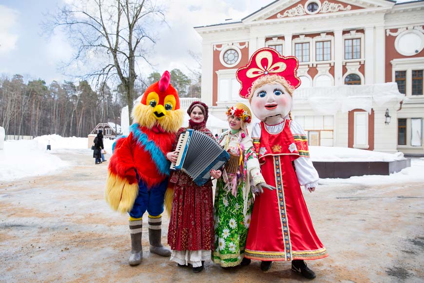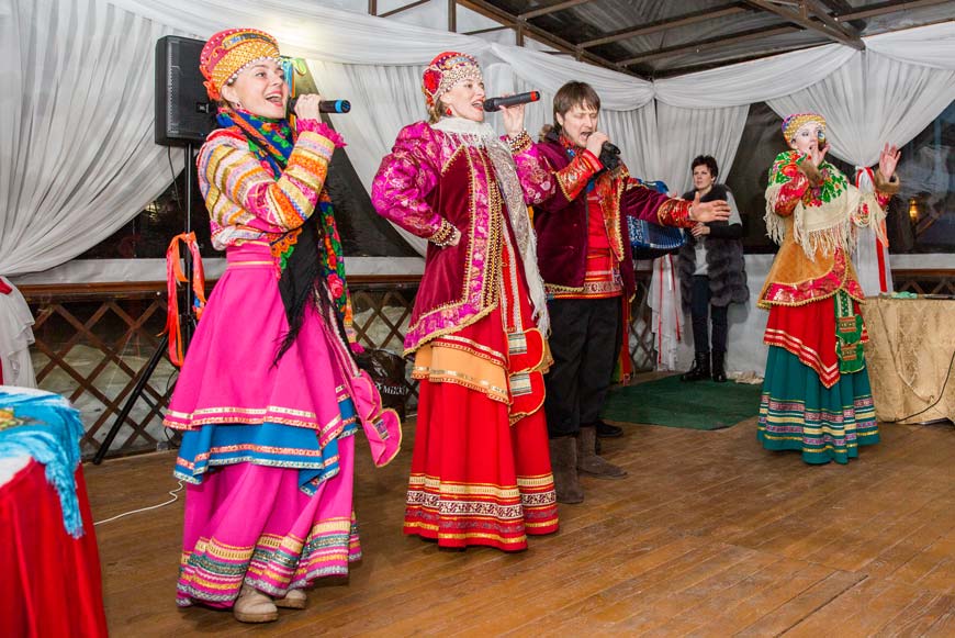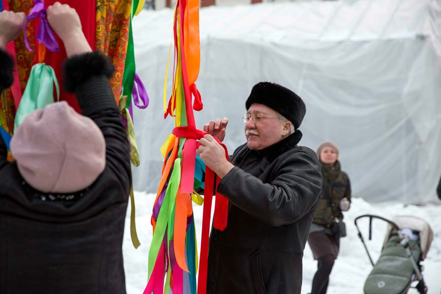 Песнями и прибаутками встречали гостей скоморохи, певцы и ростовые куклы. Непременный атрибут – яркая шёлковая ленточка, которую к концу праздника полагалось привязать к чучелу Масленицы.