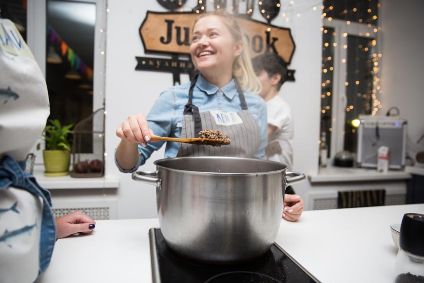 Шуму и смеху было не меньше, чем во время обычной вечеринки. Собственно, кулинарные мастер-классы и существуют как аналоги традиционных вечеринок. Сегодня такой формат очень популярен для проведения дней рождений и корпоративов, его заказывают те, кому надоело просто сидеть за столом в ресторане, кто ищет оригинальный подход к организации торжества.
