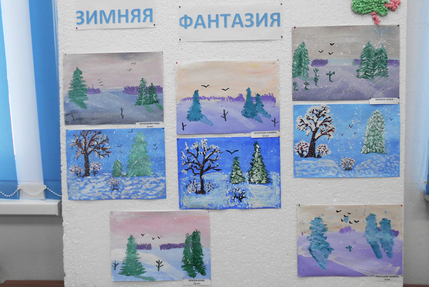 Сразу после Нового года в Общественном центре прошёл необычный конкурс рисунков. Ребята попробовали технику правополушарного (интуитивного) рисования. Этой техникой владеют даже малыши. На плотную бумажную основу участники конкурса наносили текстуру белой гуашью, затем ставили точки разными красками и растушёвывали их кисточкой, простыми движениями прорисовывая небо и деревья, падающий снег и другие атрибуты зимних пейзажей.