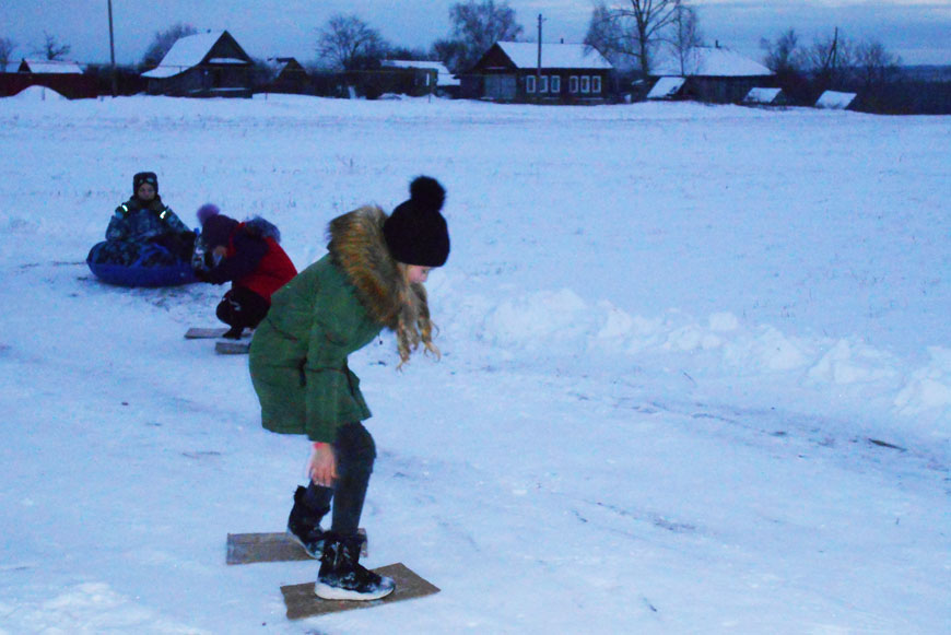 «Сани едут сами» – так называлась спортивная игровая программа. Вот только обычные санки для соревнований в селе найти не удалось, их заменили ватрушками и листами плотного картона.