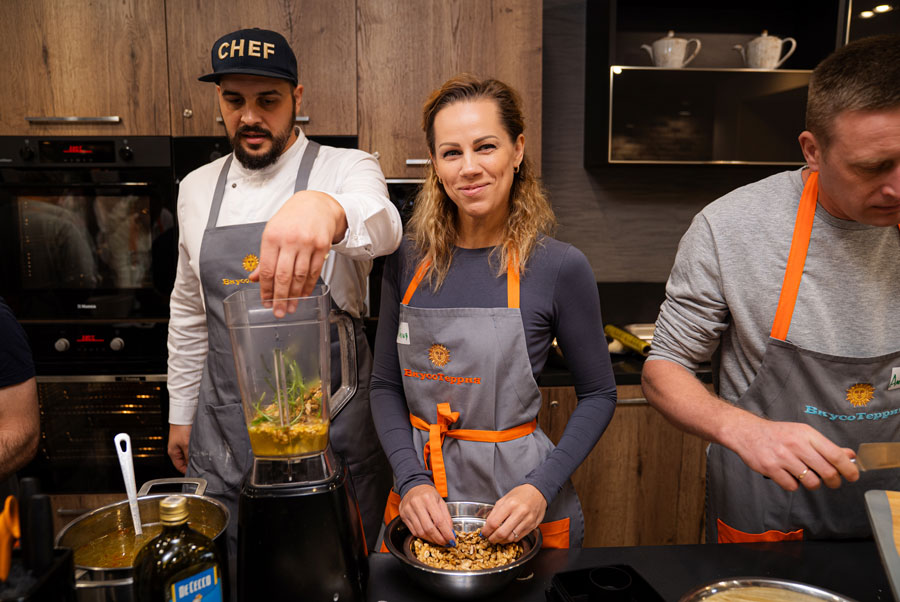 Разделившись на три команды, коллеги под руководством шеф-поваров приготовили популярные блюда, которые затем с удовольствием съели.