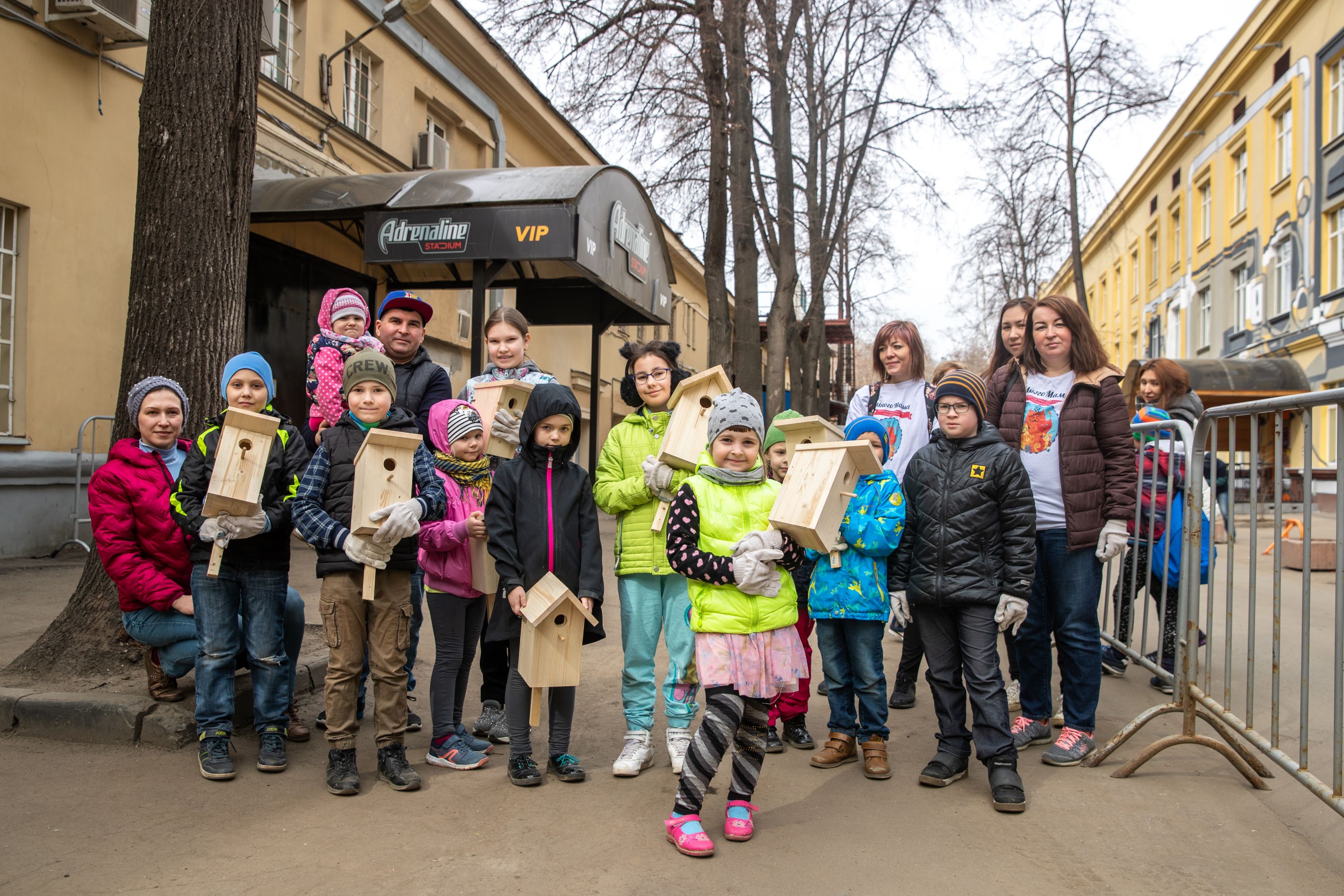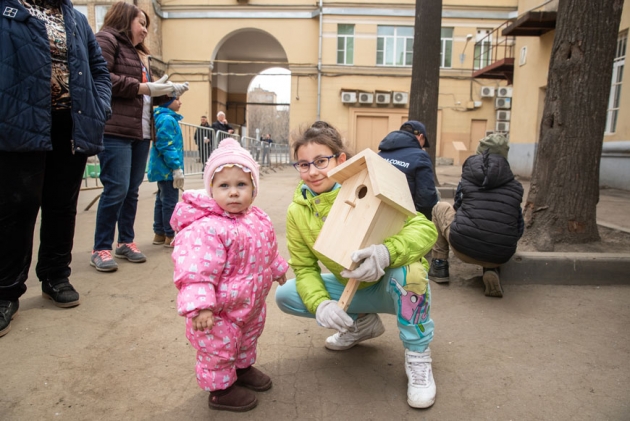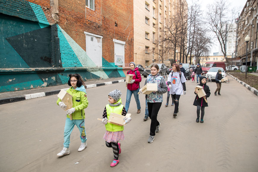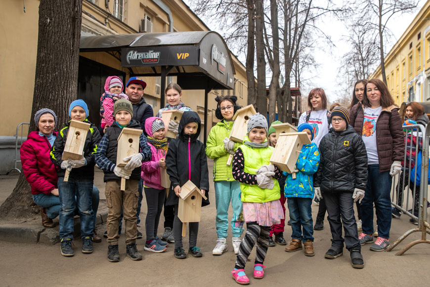 В 10:00 на площадке появился стройный отряд волонтёров из Центра помощи многодетным семьям «МногоМама», ведомый президентом Центра Алиной Контаревой. Эта организация, штаб-квартира которой находится в Галерее «МОСКВА-СОКОЛ», охотно участвует во всех мероприятия управляющей компании нашего развлекательно-делового квартала. И здесь не осталась в стороне. Благодаря «МногоМаме» в субботу на территории квартала появилось около десятка новеньких скворечников.