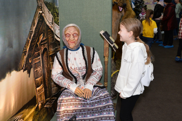 Всё можно трогать! И здесь очень много экспонатов, с которыми можно взаимодействовать: например, наведаться в избушку на курьих ножках, посмотреть, как там всё устроено – в доме знаменитой Бабы Яги, охраняющей границы двух миров, покрутить прялку – понять принцип её работы, попасть в гости к другим персонажам, и не только сказочным.